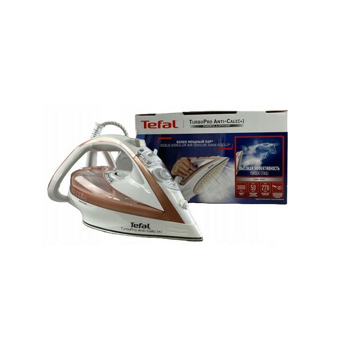 Parno glačalo snage 3000 W za brzo zagrijavanje. Tefal FV5697E1 Turbo Pro Anti Calc parno glačalo ima površinu za glačanje Durilium AirGlide Autoclean, funkciju Turbo Boost i patentirani sakupljač kamenca. Funkcija Anti-Drip i automatsko isključivanje