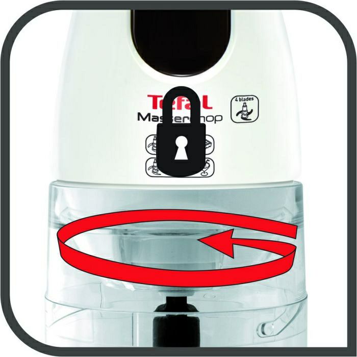 Tefal MB450B38 "Masterchop XL" sjeckalica je 3-u-1 sjeckalica, jer omogućava sjeckanje luka, češnjaka i začinskog bilja, kao i pripremu majoneze i umaka. Njegov veliki spremnik s čvrstim zatvaračem omogućuje mjerenje sastojaka do 500 ml. Njegov sigurnosni sustav osigurava sigurnu upotrebu i štiti sjeckalicu od prljavštine. Motor radi sa snagom od 500 W i sjecka čak i tvrde sastojke. Tome pridonose i 4 učinkovite oštrice od nehrđajućeg čelika koje se mogu pohvaliti 4. razredom kvalitete. Imate izbor jedne brzine koja se postiže pritiskom na vrh sjeckalice. To omogućuje mljevenje, usitnjavanje i miješanje.