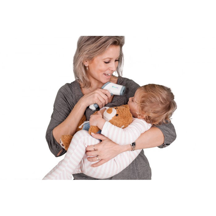 Parametri Rezultat mjerne jedinice 0,1 oC (0,1 oF) Mjerna skala Celzijevi stupnjevi, Fahrenheit Radni uvjeti za temperaturu okoline 10 - 40 oC (50 - 104 oF) Uvjeti skladištenja temperatura okoline 0 - 50 oC (32 - 122 oF) Izvor napajanja 2 × 1,5 V AAA baterija (baterije nisu uključene) Dimenzije 98 × 36,5 × 132 mm Težina 73 g Mjerno područje - režim tjelesne temperature 32,0 - 42,5 oC Područje mjerenja – temperaturni režim površine 0 – 100 oC Maks. odstupanje od izmjerene - tjelesne temperature (36 - 39 oC) ± 0,2 oC Maks. odstupanje mjerenja - površina ± 1,0 oC Udaljenost sonde od mjernog objekta je 1 - 3 cm Brzina mjerenja do 0,8 s Automatsko isključivanje 15 sekundi Jamstvo: 2 godine