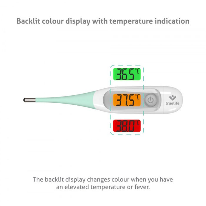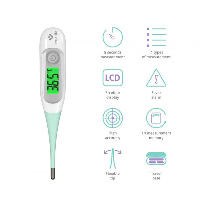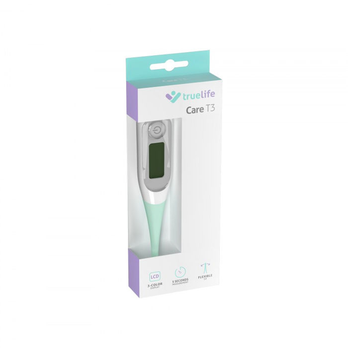 Kontaktni termometar TrueLife Care T3 – klasik u modernom ruhu Ako ste više sljedbenik klasike, svakako ćete biti zadovoljni kontaktnim toplomjerom TrueLife Care T3. Nadopunjuje ponudu beskontaktnih termometara TrueLife i dokaz je da se klasika može prezentirati i na moderan način. Ovaj pouzdani digitalni termometar sa savitljivim vrhom mjeri temperaturu za samo 5 sekundi, i to vrlo precizno. Izmjerene vrijednosti odmah ćete vidjeti na lako čitljivom displeju koji mijenja osvjetljenje ovisno o temperaturi. Termometar nježno mjeri temperaturu na tri mjesta na tijelu pa je pogodan i za bebe i za odrasle, a omogućuje i mjerenje temperature vode. TrueLife Care T3 ne sadrži živu, staklo niti bilo kakve štetne tvari pa ga možete jednostavno spremiti u putnu torbicu i ponijeti sa sobom bilo gdje. Pritom baterija traje čak 1000 mjerenja.