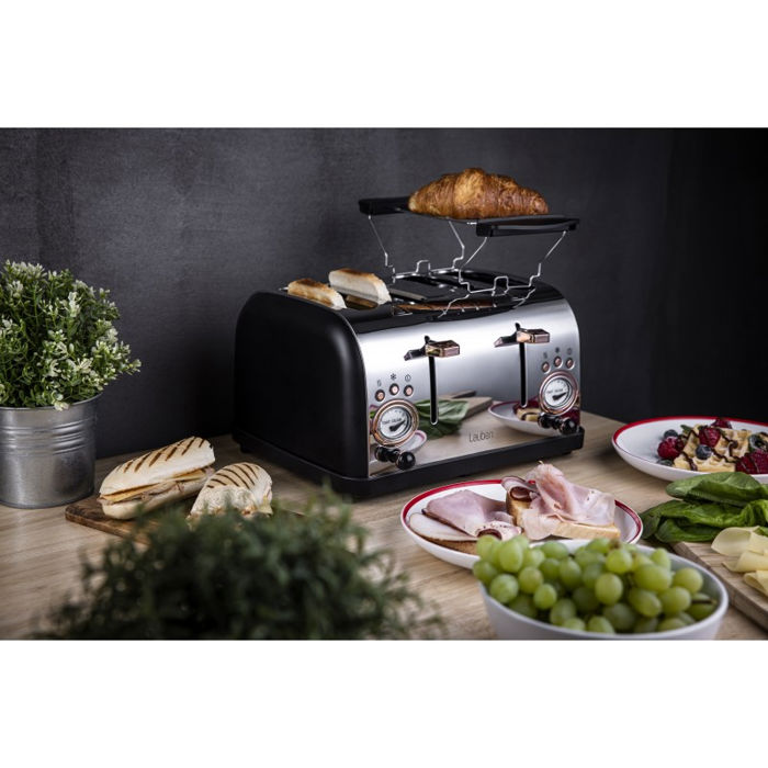 Osigurava cijelu obitelj Nema više užurbanih doručaka punih rasprava tko će prvi dobiti hrskavi tost ili kroasan. Toster Lauben 4 Slice 1500BC priprema hrskavi tostirani kruh za cijelu obitelj, a vi možete mirno uživati ??u početku novog dana. Toster će istovremeno tostirati kruh u četiri utora, a na dvije grijaće rešetke koje dolaze uz toster možete peći, primjerice, kroasane koji će biti svježe pečeni. Možete birati između šest razina intenziteta, a ako želite zaustaviti pečenje, toster ima funkciju trenutnog ručnog prekida.