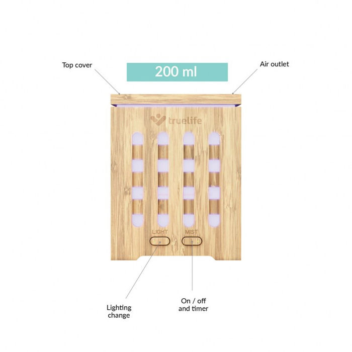 Svojstva Gornje punjenje nakon skidanja gornjeg poklopca - jednostavno i bez prolijevanja Ultrazvučna tehnologija za pretvaranje vode u finu paru Upotreba s eteričnim uljima - OilFlow tehnologija postupno otpušta eterična ulja, tako da su samo 3 kapi dovoljne za cijeli volumen spremnika LED rasvjeta u boji - izbor od 14 boja s različitim načinima rada Ručno upravljanje s dvije tipke - uključivanje / isključivanje, podešavanje količine pare, pozadinsko osvjetljenje u boji 3 načina pare – ekonomičan (difuzor radi najduže), povremeno, maksimalno (za brzo mirisanje prostorije) Bez upotrebe toksičnih tvari u proizvodnji, ne sadrži BPA, što je sigurno za djecu Do 9 sati rada s punim spremnikom (200 ml) Automatsko isključivanje u slučaju nedovoljne količine vode Tehnički parametri Boja prirodna Materijal Bambus Zapremina 200 ml Broj mjerača vremena