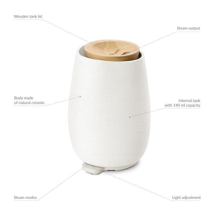 radi s ultrazvučnom tehnologijom. Pretvara vodu u paru koja se miješa sa zrakom, v