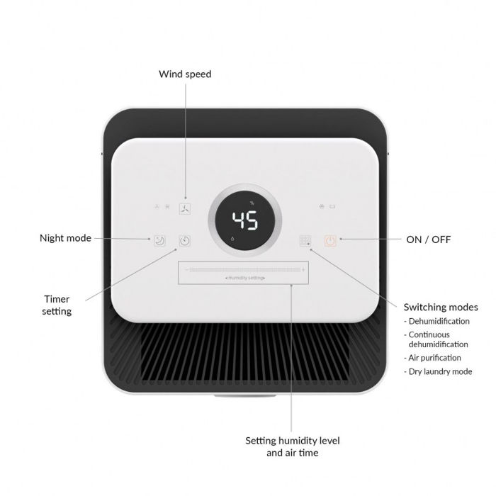 Svojstva Odvlaživač zraka uklanja do 12 l vode u 24 sata Volumen spremnika je 2,5 litara LED zaslon i zaslon osjetljiv na dodir Automatski način ovlaživanja AirFrost funkcija Ugljeni filter Kotači i ručka za jednostavno rukovanje Indikator punog spremnika Način sušenja rublja 2 načina strujanja zraka Noćni način rada Timer Kontinuirani način rada s odvodnom cijevi Pribor uključen 1× četka za čišćenje Tehnički parametri Snaga 210 W Glasnoća 37 dB Zapremina posude 2,5 l Veličina sobe 45 m2 Kapacitet odvlaživanja 2,5 l/h Visina 46 cm Širina 25 cm Dubina 25 cm Boja Bijela Jamstvo: 2 godine