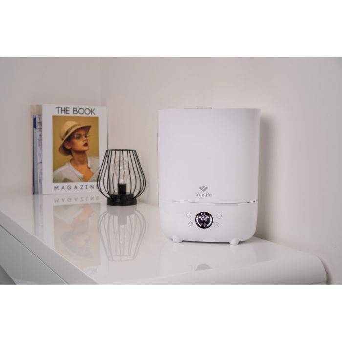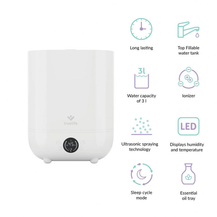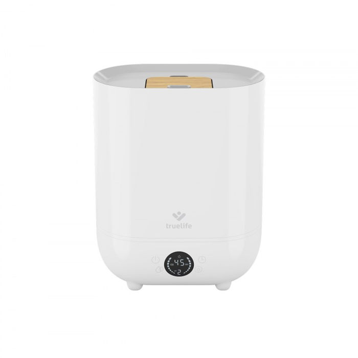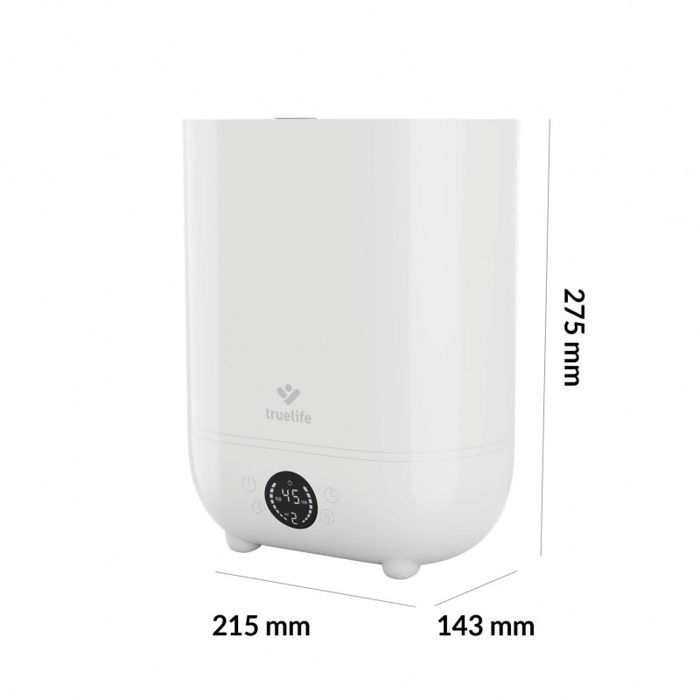TrueLife AIR ovlaživač zraka H5 Touch TrueLife AIR Humidifier H5 Touch služit će vam savršeno Spremnik za vodu ovlaživača ima zapreminu od 3 l i dovoljan je za 24 sata rada na maksimalnoj snazi. Zbog niske buke od 35 dB, neće vas ometati ni tijekom spavanja. Automatski indikator niske razine vode osigurava da se uređaj automatski isključi pri niskim razinama. Rukovanje je vrlo jednostavno - kada otvorite gornji poklopac, napunite spremnik i koristite 4 dodirne tipke za paljenje, gašenje uređaja, podešavanje intenziteta pare, noćni način rada ili razinu vlažnosti.