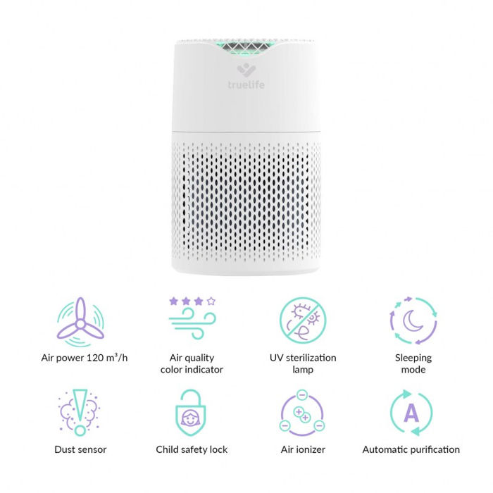 Ključne značajke TrueLife AIR Purifier P3 WiFi 6 puta filtracija UV lampa s ionizatorom Mogućnost kontrole putem mobilne aplikacije Dječja brava TrueLife AIR Purifier P3 WiFi 6 puta filtracija za zdravo kućanstvo Pročistač zraka čisti do 120 m3 na sat i prikladan je za prostoriju od 12 - 18 m2. Uređaj poboljšava kvalitetu zraka, uništava viruse, bakterije i druge nečistoće te može pomoći alergičarima i astmatičarima. Indikatori kvalitete zraka u boji, automatsko otkrivanje prljavštine i automatsko čišćenje. 6-struka filtracija u obliku antibakterijskog filtra, HEPA filtra, ugljenog filtra, katalitičkog filtra, UV svjetla i ionizacije hvata do 99,9% prašine u zraku i čisti 93,5% hlapljivih organskih spojeva. Također otkriva viruse i koronaviruse.