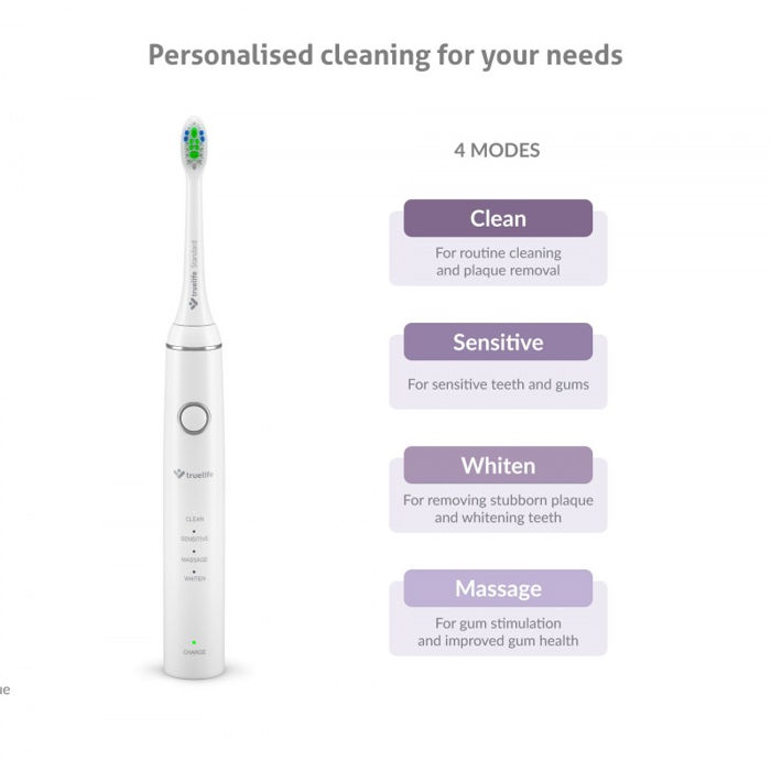 Četiri metode čišćenja za svakodnevnu njegu Četke iz seta Truelife SonicBrush Compact Duo nude četiri načina čišćenja koji holistički brinu o vašim ustima. Clean način je najčešći i pogodan za svakodnevnu uporabu. Osjetljivi zubi i desni mogu se bez brige povjeriti načinu rada Sensitive. Način rada Whiten pomoći će vam da postignete prekrasan bijeli osmijeh, dok će način rada Massage omogućiti ugodnu masažu desni.
