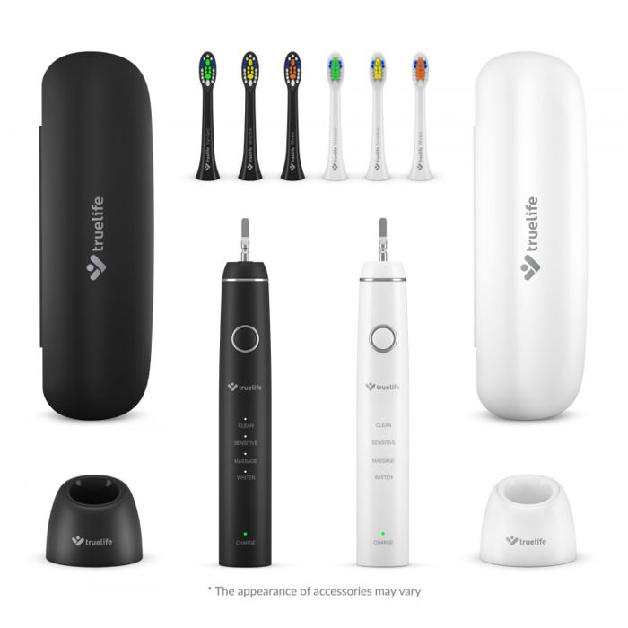 Truelife SonicBrush Compact Duo - Set od dvije sonične četke Želite li imati zdrave zube i desni? Ne želite li biti pod stresom svaki put kada posjetite stomatologa? I vi i vaš partner možete se osloniti na TrueLife SonicBruch Compact četku s modernom SonicTrue® soničnom tehnologijom. U setu SonicBrush Compact Duo pronaći ćete dvije zvučne četke, 6 zamjenskih glava (Sensitive, Standard, Whiten), 2 putne torbice i 2 baze za punjenje. Priuštite si ekskluzivnu stomatološku njegu zahvaljujući kojoj će vaš osmijeh biti blistav, a štetne bakterije neće imati šanse. Vlakna četkice osciliraju velikom brzinom do 70 000 pokreta u minuti, a svakim pokretom maksimalno uklanjaju plak. Možete birati između četiri načina čišćenja. Baterija četkice traje do 30 dana.