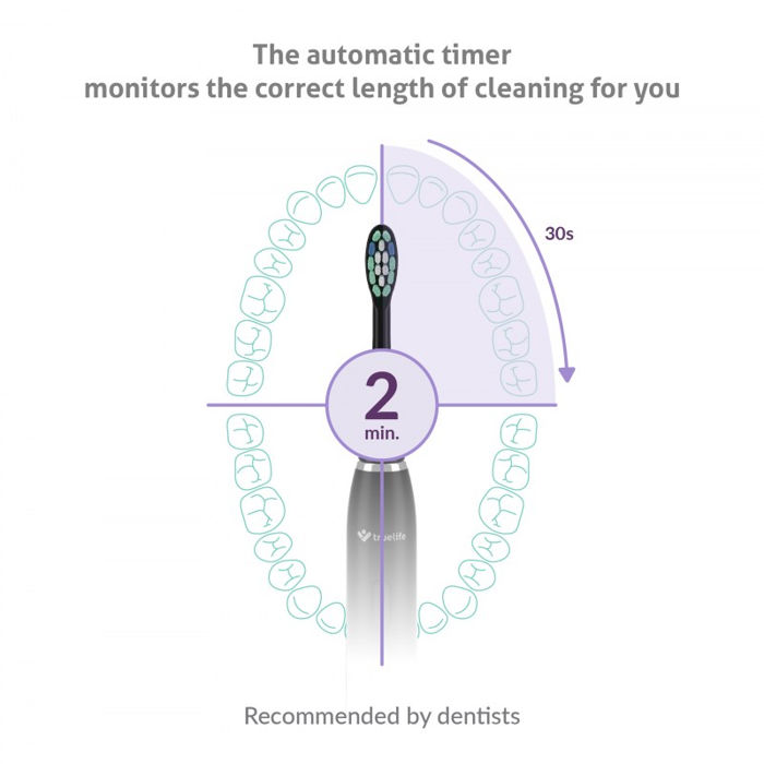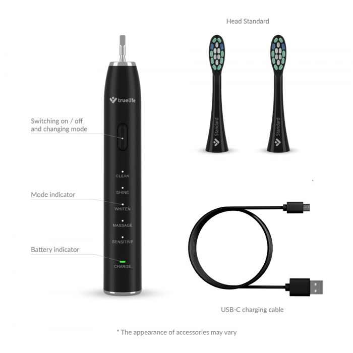 TrueLife SonicBrush Clean30 Black - Kvalitetna njega zuba za svakoga Lijep osmijeh počinje svakodnevnom pravilnom njegom zuba. TrueLife SonicBrush Clean30 sonična četkica za zube pristupačan je i moćan alat koji vam može pomoći da postignete zdrav i blistav osmijeh. Uz našu SonicTrue® tehnologiju, četkica omogućuje 70 000 pokreta u minuti, čisteći zube učinkovitije od ručnog četkanja. Možete birati između 5 načina čišćenja: način Clean uklanja plak i bakterije, način Shine uklanja mrlje od čaja i kave, način Whiten izbjeljuje zube, način Massage stimulira zubno meso, a način rada Sensitive nježan je za zube i desni. . Četkice za zube dolaze s 2 standardne glave koje je potrebno mijenjati svaka 3 mjeseca, što je zgodno naznačeno plavim vlaknima koja postaju bijela. Traje 30 dana s jednim punjenjem, a četkica se može jednostavno puniti priloženim USB-C kabelom.