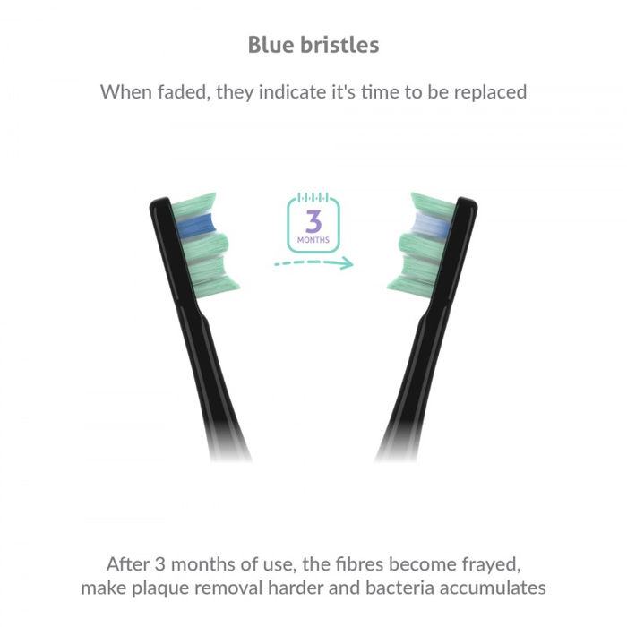 Učinkovita SonicTrue® tehnologija Sonic tehnologija je učinkovito rješenje u borbi protiv plaka, a istovremeno je nježna prema vašoj zubnoj caklini. Dinamičnim djelovanjem tekućina ne samo da čisti površinu Vaših zubi, već i učinkovito dopire do međuzubnih prostora. SonicTrue® koristi ovu tehnologiju s nježnim vibracijama i može se pohvaliti nevjerojatnom izvedbom do 70 000 pokreta u minuti. Ovo je značajan korak u odnosu na 600 poteza koje može postići ručna četkica za zube, obećavajući briljantno čist osmijeh uz manje napora. Svaka glava četkice dizajnirana je da traje do 3 mjeseca: nakon toga se dlake mogu početi pucati, izgubiti svoju funkcionalnost i postati leglo bakterija. Kako bismo osigurali da vaša higijena ostane beskompromisna, naše glave četkica opremljene su plavim čekinjama koje blijede i daju vidljiv znak kada je vrijeme za promjenu.