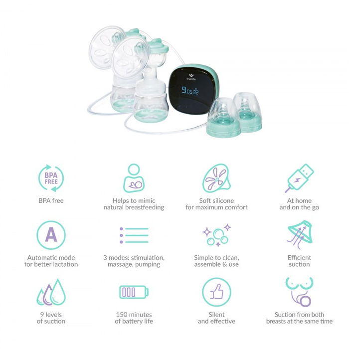 TrueLife Nutrio BP Electric Double - Električna pumpa za majčino mlijeko TrueLife Nutrio BP Electric Dvostruka električna pumpa za grudi izvrstan je dodatak za njegu bebe koji pruža udobnost vama i vašoj bebi. Pumpa ispumpava mlijeko iz obje dojke istovremeno i na taj način Vam pomaže da brže riješite trenutni nedostatak ili obrnuto višak mlijeka nego klasična pumpica. Osim toga, uz pomoć dvostruke pumpice ispumpavate u prosjeku 18% više mlijeka nego kod izdajanja iz svake dojke zasebno. S Nutria BP Electric Double možete pripremiti mlijeko za kasnije, na primjer, kada dijete spava ili nije gladno. Takvo mlijeko može trajati do 48 sati u hladnjaku. Pumpicu možete nositi sa sobom na izlete, ne zauzima puno mjesta, lako se sklapa i čisti. Uz dvostruku pumpicu možete kupiti poseban TrueLife Nutrio Bra za pričvršćivanje, koji se može koristiti i za dojenje.
