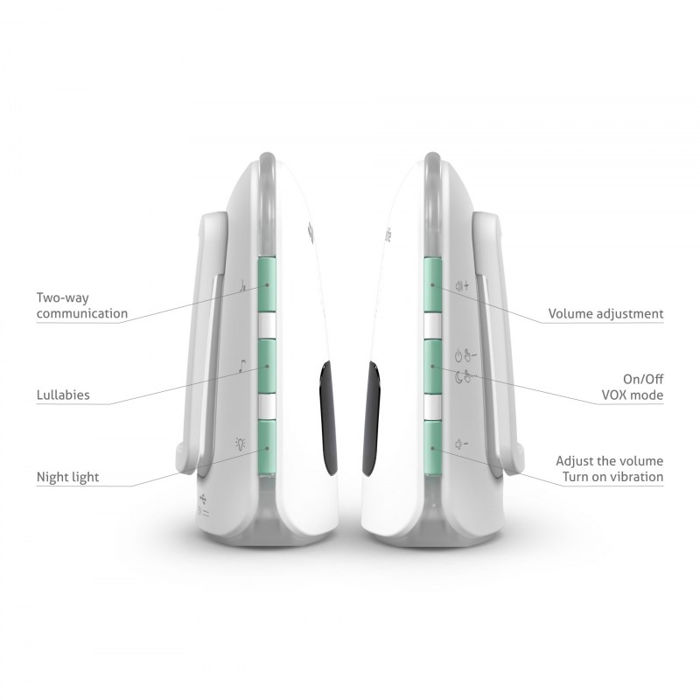 Noćno svjetlo Parametri Vrsta elektroničkog baby monitora Digitalni audio elektronički baby monitor Domet 800 m na otvorenom, 300 m u zgradi Vrsta baterije Litij-ionska roditeljska jedinica od 750 mAh, Litij-ionska jedinica za bebu od 1200 mAh Trajanje baterije Do 7 sati roditeljska jedinica, do 10 sati dječja jedinica Punjenje baterije 3-4 sata roditeljska jedinica, 6-7 sati dječja jedinica Značajke VOX način rada, detekcija gubitka signala, dvosmjerna komunikacija, senzor temperature s detekcijom visoke i niske temperature, detekcija prazne baterije, podešavanje osjetljivosti alarma, vibracija, nečujni način rada, podešavanje glasnoće, noćno svjetlo, lokator zvuka roditeljske jedinice, uspavanke LCD zaslon Da, 27 × 26 mm Toplinska zaštita Da