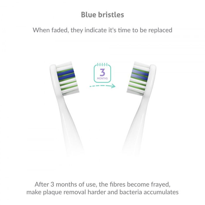 TrueLife SonicBrush Slim-series glava Standard white 2 pak Glava traje oko tri mjeseca korištenja, ali tada počinje hrđati, gubi učinkovitost i na njoj se skupljaju bakterije. Srećom, glave su opremljene plavim dlačicama koje izblijede nakon tri mjeseca i odmah znate da glavu treba zamijeniti.