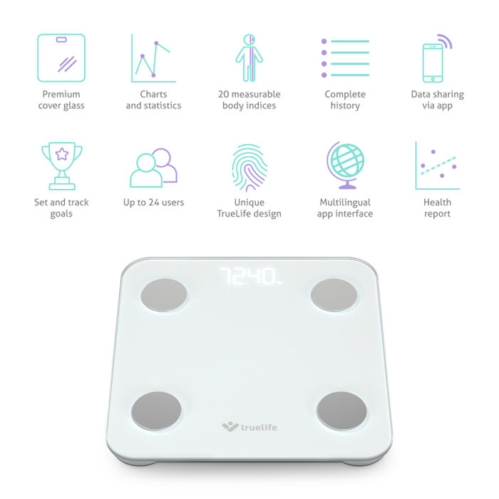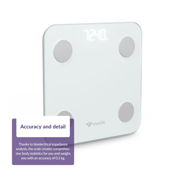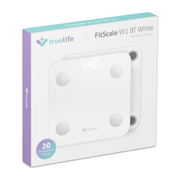 TrueLife FitScale W1 je pametna osobna vaga koja omogućuje precizno praćenje sastava tijela uz naprednu analizu bioelektrične impedancije (BIA). Osim mjerenja tjelesne težine, pruža uvid u 20 ključnih tjelesnih pokazatelja kao što su postotak tjelesne masti, mišićna masa, sadržaj vode u tijelu i drugi.