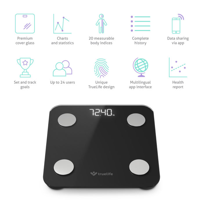 TrueLife FitScale W1 je pametna osobna vaga koja omogućuje precizno praćenje sastava tijela uz naprednu analizu bioelektrične impedancije (BIA). Osim mjerenja tjelesne težine, pruža uvid u 20 ključnih tjelesnih pokazatelja kao što su postotak tjelesne masti, mišićna masa, sadržaj vode u tijelu i drugi.