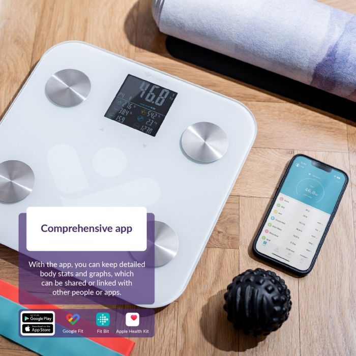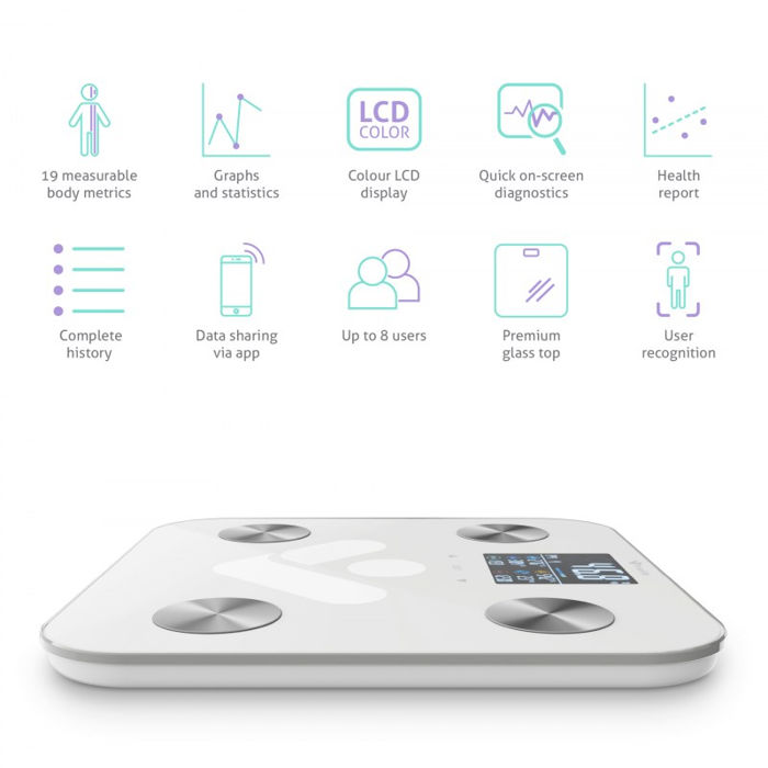 Ostvarite svoje ciljeve brže uz pomoć aplikacije Oduprite se minimalizmu Minimalistički dizajn vage s vrhunskim pokrovnim staklom izdržava do 180 kg i savršeno se uklapa u vaš prostor. Vaganje je sigurno jer vaga ostaje na mjestu i vaga s odstupanjem od samo 0,1 kg.