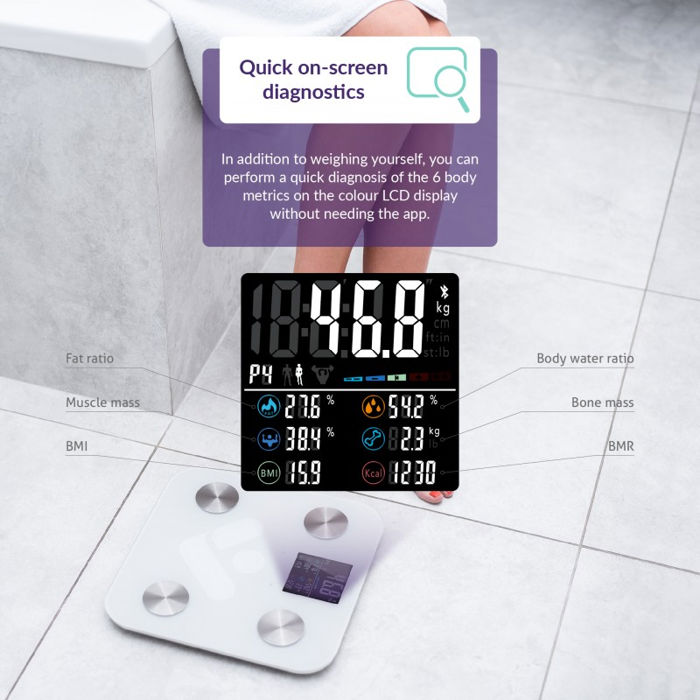 Premium pokrovno staklo Tehnički parametri Vrsta skale Bioelektrična impedancija bluetooth skala Metoda mjerenja Analiza bioelektrične impedancije Broj mjernih indeksa 19 u aplikaciji/7 na ekranu Mjereni indeksi Masa, BMI (Indeks tjelesne mase), BFR (Restrikcija krvotoka), BMR (Basal metabolic rate), mišićna frekvencija, mišićna masa, omjer vode u tijelu, koštana masa, količina proteina u tijelu, metabolička dob, visceralna mast, standardna težina, kontrola težine, omjer tjelesne masti, masa bez masti, razina pretilosti, tip tijela, vrijednost proteina, rezultat Broj korisnika 8 Raspon vaganja 0,2 ~ 180 kg Maksimalna nosivost 180 kg Maksimalno odstupanje 0,1 kg Mobilna aplikacija Da LCD zaslon u boji Bluetooth povezivanje iOS, Android kompatibilnost Sinkronizirajte Apple HealthKit, Google Fit, Fitbit Napajanje 4x AAA, 6 V Potrošnja energije/stanje mirovanja < 50 mA/< 100