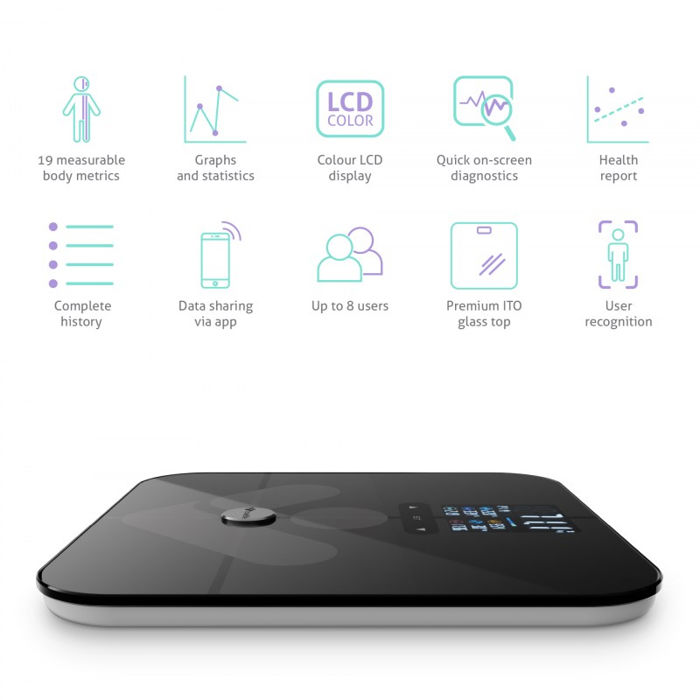 Preciznost i izdržljivost u elegantnom dizajnu 19 izmjerenih tjelesnih indeksa Upoznavanje vlastitog tijela nikada nije bilo lakše. 19 tjelesnih indeksa, čiju ćete opsežnu analizu vidjeti u aplikaciji, otkrit će vam sve što trebate.