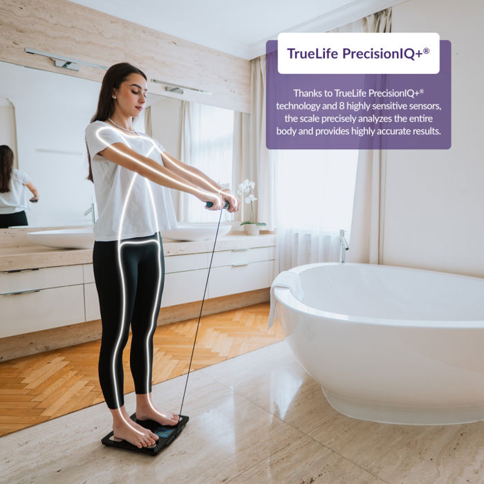 mjerenje cijelog tijela - od stopala do šaka - zahvaljujući 8 vrlo osjetljivih senzora i tehnologiji TrueLife PrecisionIQ+®. Vaga stoga daje sveobuhvatne rezultate koje konvencionalne vage s 4 senzora ne mogu ponuditi. Vrhunski senzori dopunjeni su naprednim algoritmima i inteligentnom analizom podataka za točna i pouzdana mjerenja. Rezultat je detaljna procjena sastava tijela, uključujući zdravstvene pokazatelje, koja je brža i preciznija od tradicionalne