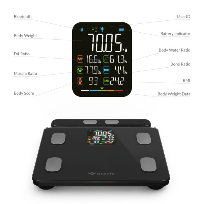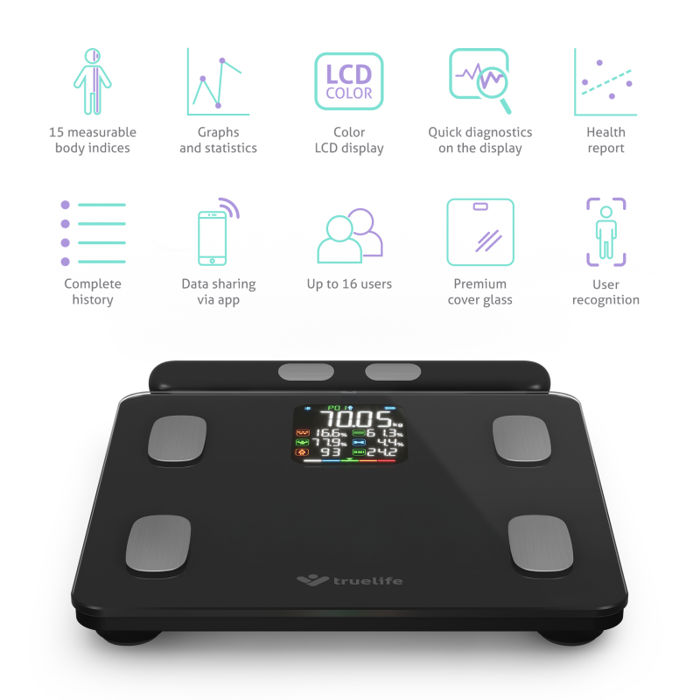TrueLife FitScale W8 BT Black otkriti svoje detalje. Tehnologija TrueLife PrecisionIQ+® koristi 8 visokoosjetljivih senzora i analizu bioelektrične impedancije za mjerenje ukupnog sastava tijela. Prozirni LCD zaslon u boji prikazuje ukupno 7 informacija – osim težine, također pokazuje postotak masti, mišića ili vode. Ako se povežete s aplikacijom putem Bluetootha, primit ćete jasno izvješće s 15 indeksa tijela i njihovim opisima. Vaga može pratiti do 16 korisnika, a aplikacija bilježi zadnjih 15 mjerenja. Automatski prepoznaje svakog korisnika tako da nema potrebe mijenjati ništa. Međutim, svatko može koristiti vagu bez aplikacije. Poklopac Premium od kaljenog stakla je elegantan i vrlo izdržljiv s nosivošću do 180 kg. Prilikom vaganja možete odabrati jedinice, kilograme ili funte. Tolerancija vaganja je samo 0,1 kg, tako da će vaši rezultati biti doista točni.