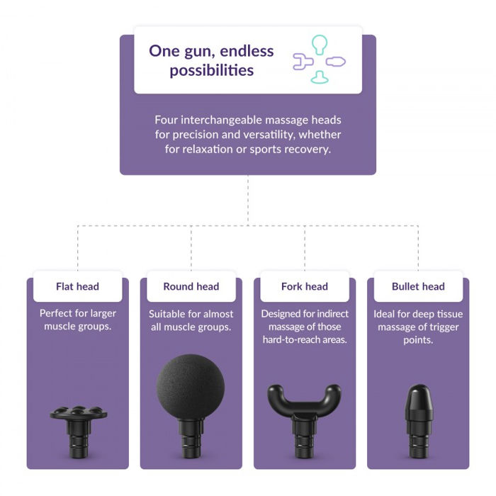 Masažne glave za sve vaše potrebe TrueLife RelaxGun G3 pištolj za masažu opremljen je s 4 specijalizirane glave za masažu. Flat Head je jedan od najčešće korištenih i cilja na veće mišićne skupine kao što su leđa i bedra. Za doseganje izazovnih područja kao što su tetive koljena i zapešća, glava vilice ima dva uska vrha koji pružaju ciljano olakšanje i omogućuju duboku masažu mišića. Okrugla loptasta glava prilagođava se konturama vašeg tijela, tako da je idealna za gotovo sva područja mišića. odgovara gotovo svim dijelovima mišića i prilagođava se obliku vašeg tijela. Svrha Bullet Heada je masaža određenih točaka na tijelu, tzv. trigger pointa.