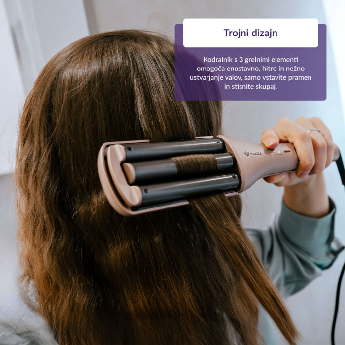 TrueLife HairWaver W6 možete stvoriti prirodno valovitu kosu u tren oka i bez pomoći frizera. Dobro osmišljen trostruki dizajn osigurava jednostavno i brzo stvaranje kovrči i maksimalnu njegu kose. 3 grijaća dijela rade učinkovitije i održavaju stalnu temperaturu tijekom upotrebe zahvaljujući tehnologiji TrueLife ConstantHeat®. Možete kreirati prirodne, fleksibilne valove točno prema vašoj mašti, grijaća površina je rastezljiva, tako da možete postaviti 4 različite valne duljine. Opcije postavke temperature dostupne su u 4 razine. Uvijač je pogodan za sve tipove kosekoja se svojom keramičkom površinom doslovno mazi i njeguje. Njegova posebnost također leži u sposobnosti brzog zagrijavanja koje traje samo 30 sekundi. Rad s postoljem će vam se svidjeti i zbog njegove praktičnosti i ugodnog korištenja. Ima okretni kabel za 360° i zaključavanje što ga čini jednostavnim za spremanje, na primjer kada putujete. Počastite se pravim valovima kose u različitim oblicima.