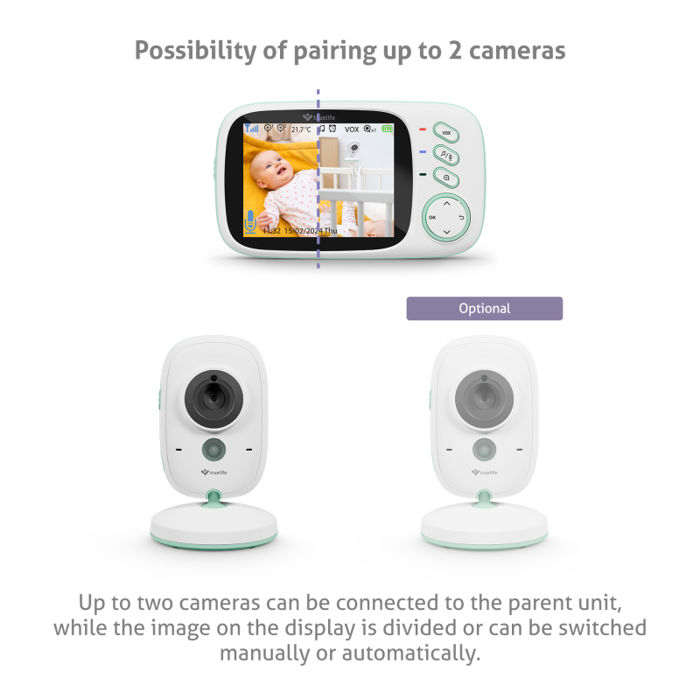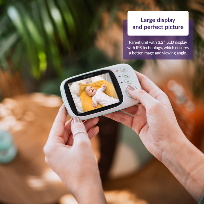 TrueLife NannyCam H32 Pro – Najpouzdaniji čuvar vašeg djeteta Ovdje je znatno poboljšana generacija TrueLife NannyCam H32, koja je vrlo popularna među roditeljima, upoznajte TrueLife NannyCam H32 Pro. Čim se dijete rodi, počinjemo se brinuti za njega i moramo imati pregled nad svime što radi. U svojoj poboljšanoj verziji, ova od strane kupaca testirana dadilja izvrsno će se brinuti za vaše potomke, od najmanjih do najstarijih. Njegov izvrstan kut gledanja i savršena slika prenesena na 3,2” LCD zaslon s IPS tehnologijom osiguravaju pregled nad zbivanjima u bilo koje doba dana i noći. Noćni vid se automatski aktivira čim padne mrak. Kada vam nešto zapne za oko i morate bolje pogledati, nema problema s funkcijom zumiranja. Možete se udaljiti od djeteta do 300 m, koliko je domet roditeljske jedinice. Dadilja također može detektirati temperaturu u sobi i obavijestiti vas kada se promijeni. Kada trebate umiriti svoju bebu, pomoći će vam 8 unaprijed postavljenih uspavanki. Ili možete koristiti opciju dvosmjerne komunikacije i utješiti bebu vlastitim glasom. Iako baterija traje jako dugo, možete joj produžiti vijek trajanja uključivanjem VOX moda za uštedu energije. Korisna značajka roditeljske jedinice je podsjetnik za hranjenje. Ako želite pokriti više područja, možete spojiti do 2 kamere na roditeljsku jedinicu, što se može nadopuniti posebnim TrueLife NannyCam H32 držačem za pričvršćivanje na dječji krevetić. Zatim možete po potrebi nagnuti kameru jedinice za bebu.