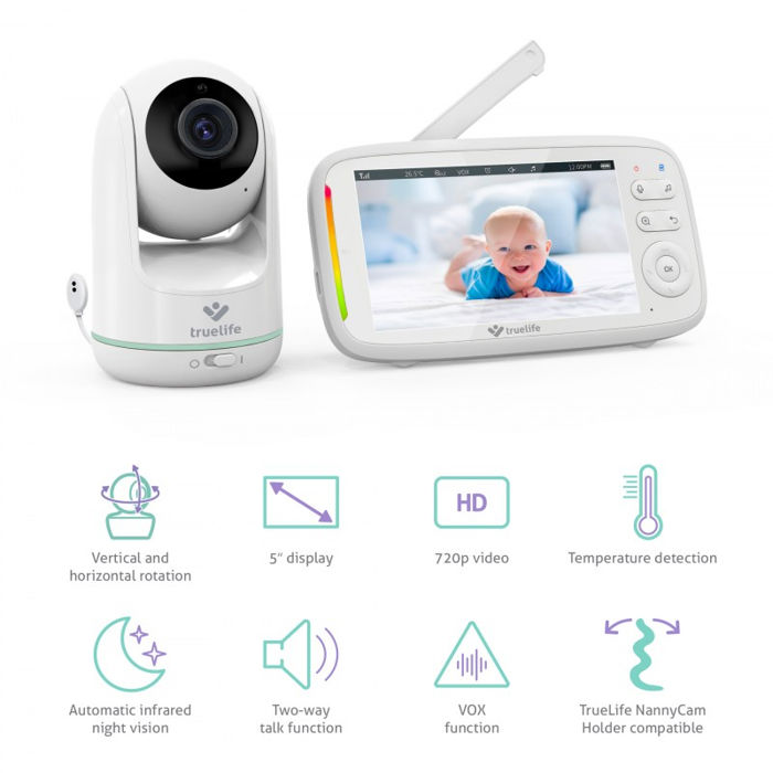 TrueLife NannyCam R5 – Rotirajuća elektronička dadilja kojoj ništa ne nedostaje Svaki roditelj želi svoju djecu držati pod kontrolom u svakom trenutku, bilo da su bebe ili starija djeca. TrueLife NannyCam R5 rotacijska elektronička dadilja za 360° savršen je pomoćnik za praćenje svakog pokreta i zvuka. Visoka rezolucija kamere od 720p osigurava potpuno čistu sliku, koja se prenosi na roditeljsku jedinicu s 5" LCD zaslonom i dometom do 300 m. uz pomoć automatskog noćnog vida ništa vam neće promaknuti ni u mraku. Iz roditeljske jedinice moguće je kontrolirati okretanje čuvalice i tako vidjeti svaki kutak u točnom trenutku kada zvučni LED zaslon signalizira da se nešto događa u dječjoj sobi. Babysitter također ima detekciju temperature, osam uspavanki ili dvosmjernu komunikaciju te funkciju podsjetnika za hranjenje. Iako baterija ima dugu izdržljivost, dodatno ćete je uštedjeti uključivanjem VOX moda.
