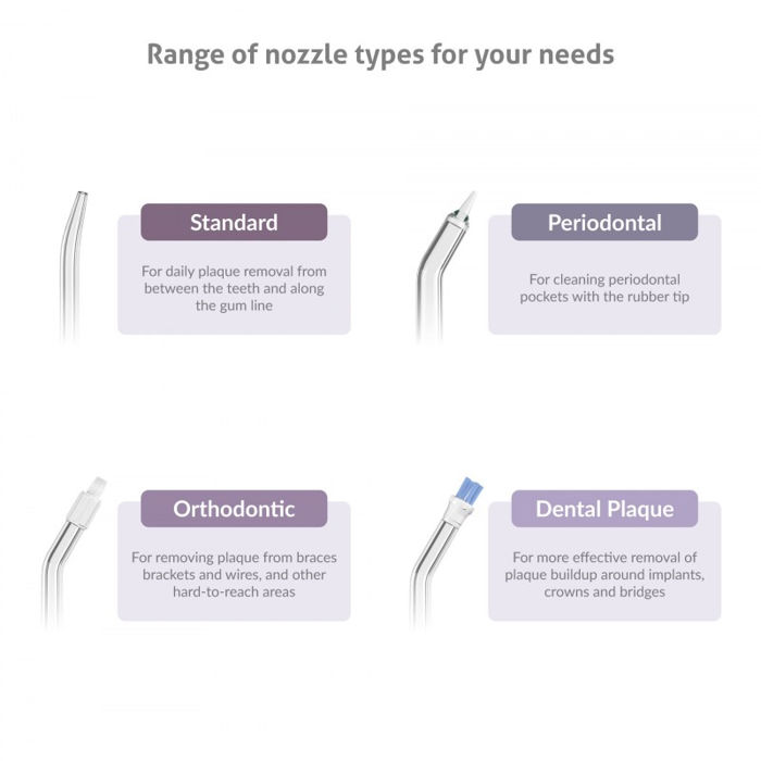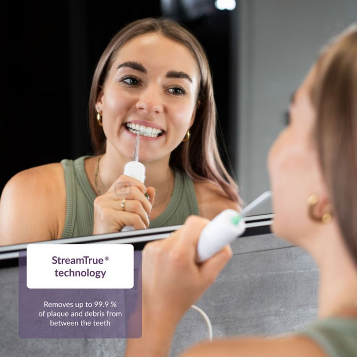 Standard – Dizajniran za uklanjanje plaka iz međuzubnih prostora i bora uz zubno meso. Ortodontski - Ortodontska mlaznica za uklanjanje naslaga s bravica i žica zubnih aparata i drugih teško dostupnih mjesta. Parodontalna – Parodontalna mlaznica za čišćenje parodontnih džepova uz pomoć gumenog vrha. Zubni plak – Namijenjen je učinkovitijem uklanjanju nakupljenih naslaga oko implantata, ispuna i mostova. Oralna higijena po Vašoj želji StreamTrue® tehnologija Mikromjehurići koji se sastoje od vode i zraka pod visokim pritiskom potiskuju u međuzubni prostor i tako učinkovito uklanjaju čak 99% naslaga i prljavštine na teško dostupnim mjestima.