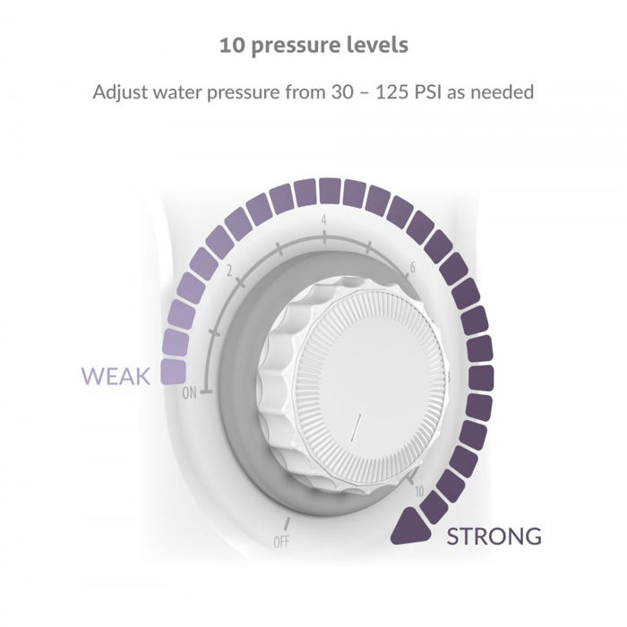 Jednostavan za korištenje i upravljanje Oralna higijena po Vašoj želji Uz AquaFloss Station S600 imate deset razina pritiska vode u rasponu od 30-125 PSI, tako da možete potpuno prilagoditi svoje čišćenje zubi. Postavite željeni tlak pomoću kotačića na stanici. Sastavni dio tuša je šest posebnih mlaznica (3× Standardna, 1× Ortodontska, 1× Parodontalna, 1× Dental Plaque), dizajniranih za različite potrebe: