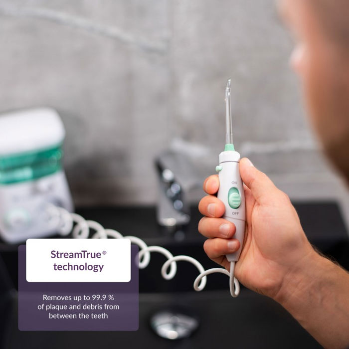 Zašto je dobro koristiti zubni tuš AquaFloss Station? Poboljšava cirkulaciju krvi u desnima. Nježno masira i stimulira desni. Uništava štetne bakterije u međuzubnom prostoru i na rubu desni. Nudi dodatnu zaštitu kod ozljeda i upala zubnog mesa. Bori se protiv upala, karijesa i sveobuhvatno poboljšava zdravlje desni i usne šupljine. Pomaže u uklanjanju neugodnog zadaha i poboljšava oralnu higijenu. Savršeno sredstvo za čišćenje zubnih aparata, ispuna i implantata. StreamTrue® tehnologija Mikromjehurići koji se sastoje od vode i zraka pod visokim pritiskom potiskuju u međuzubni prostor i tako učinkovito uklanjaju čak 99% naslaga i prljavštine na teško dostupnim mjestima.