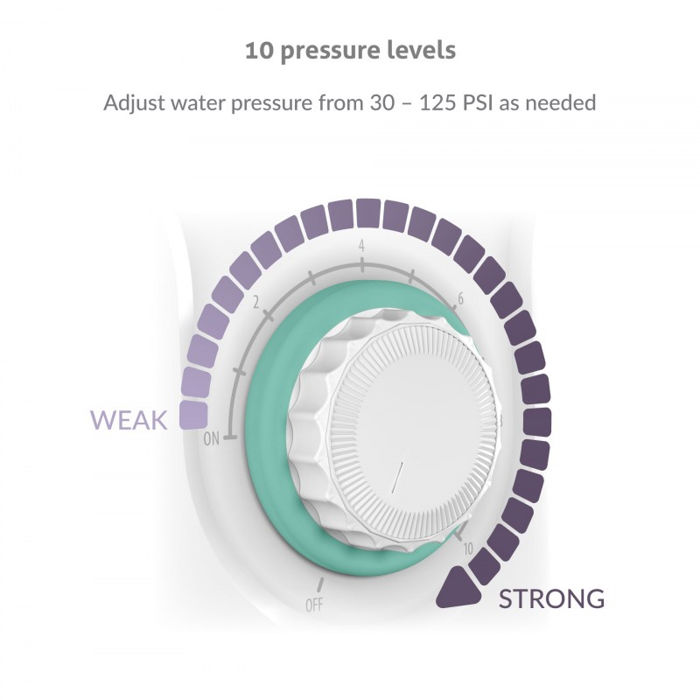 10 razina pritiska Mlaznica ima 10 razina pritiska pod kojima ubrizgava mješavinu kapljica vode i zraka u usta. Na taj način lako ćete odabrati optimalnu čvrstoću ili se o tome posavjetovati sa svojim stomatologom.
