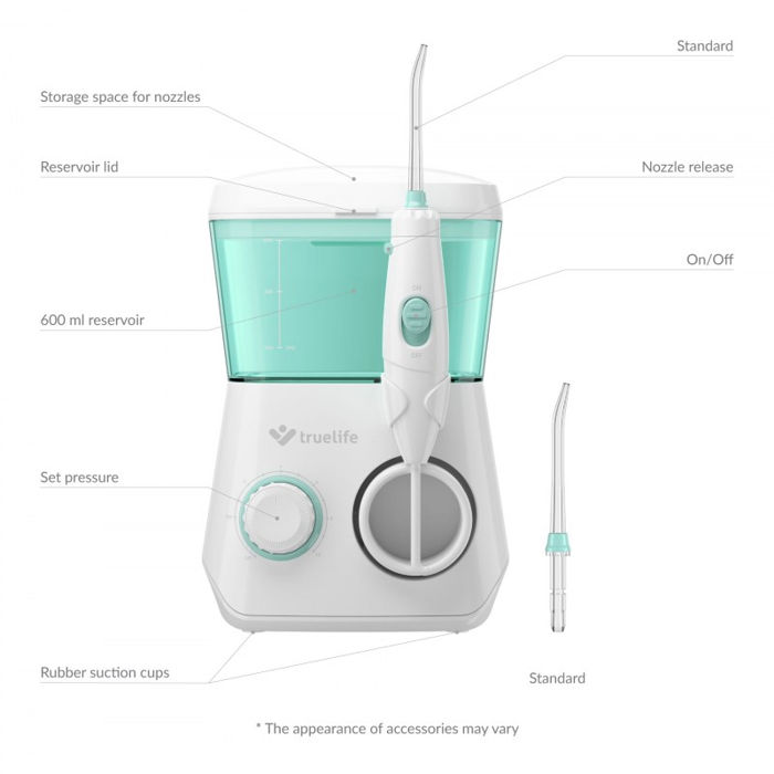 10 razina pritiska Dvije mlaznice u paketu Naš oralni tuš ima u pakiranju čak dvije izmjenjive mlaznice za nekoliko članova vaše obitelji. Istodobno, robna marka TrueLife nudi mogućnost kupnje posebnih glava za nadopunu opreme za oralnu higijenu.