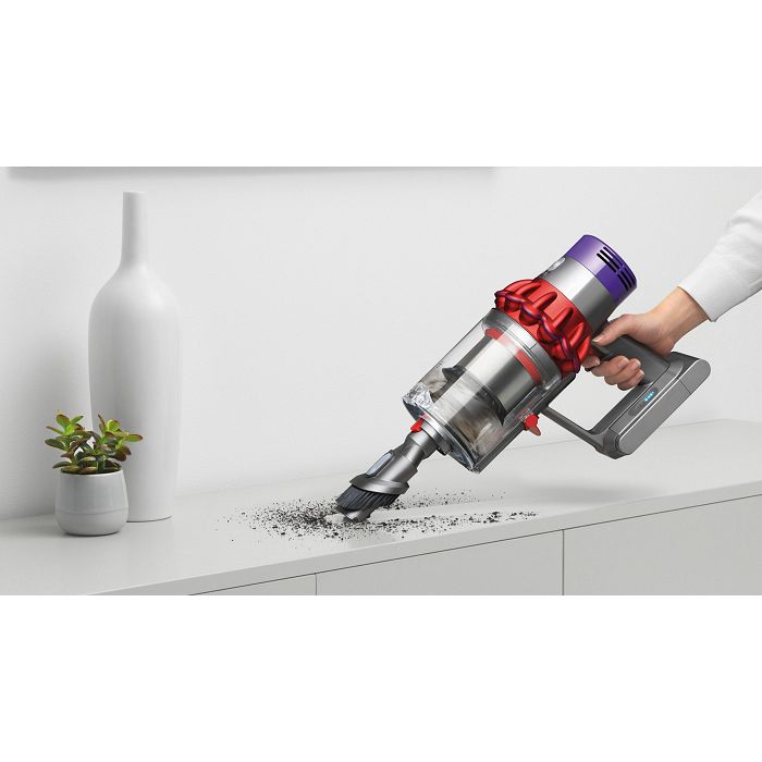 Snažan bežični usisavač. Raspetljava. Za sve podove. Snažno usisavanje - Dysonov digitalni motor V10 stvara usisnu snagu vakuuma pune veličine. S do 60 minuta usisavanja bez blijeđenja. Projektiran za domove s kućnim ljubimcima - Dysonova najnovija tehnologija za raspetljavanje uklanja tvrdokorne dlake iz cijelog vašeg doma. MotorbarTM s češljem za raspetljavanje - Polikarbonatne lopatice automatski uklanjaju umotanu kosu s šipke četke dok čistite. Mini motorizirana četka - Motorizirana četka rješava dlake i tvrdokornu prljavštinu u uskim prostorima, madracima, presvlakama i stepenicama.