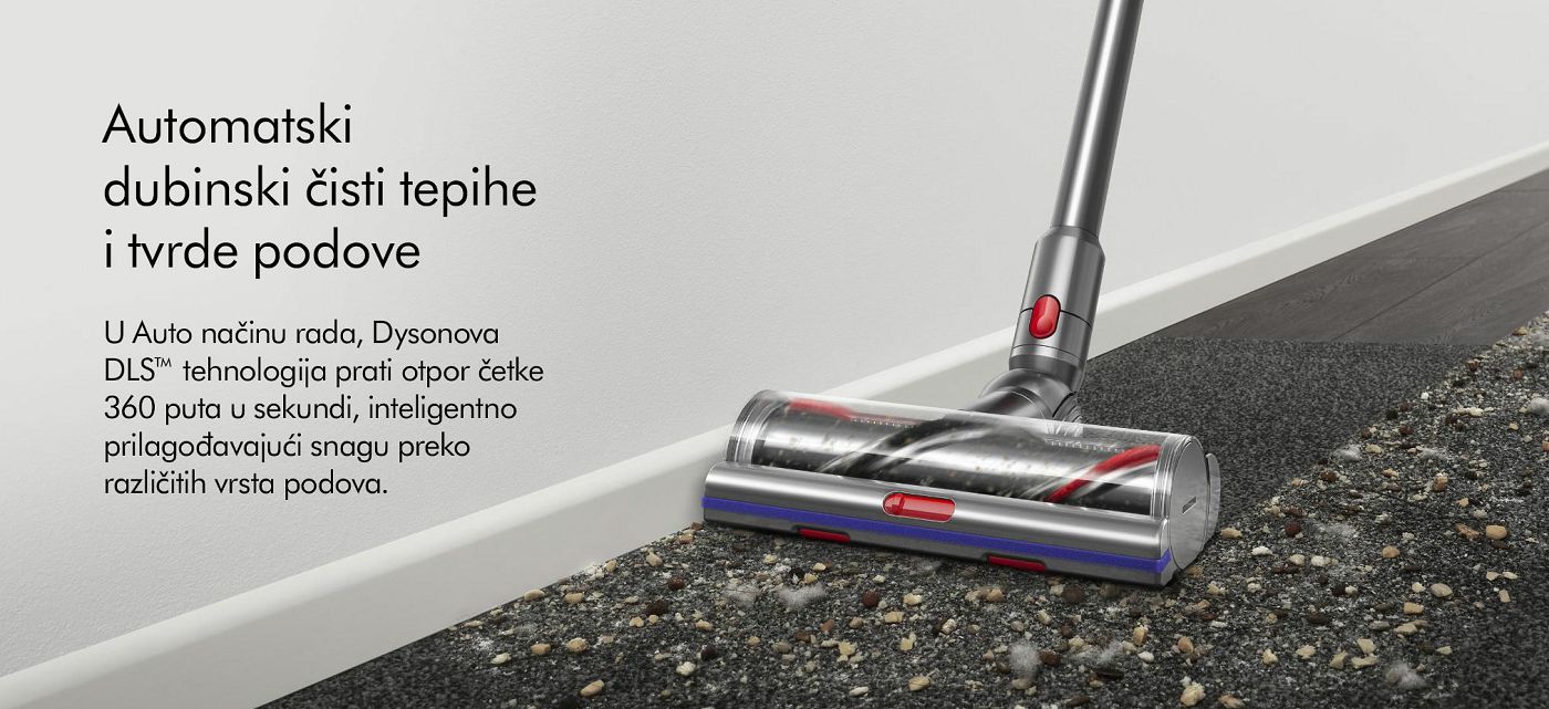 U automatskom načinu rada, tehnologija Dyson DLS™ prati otpor četke 360 puta u sekundi, inteligentno prilagođavajući snagu različitim vrstama podova.