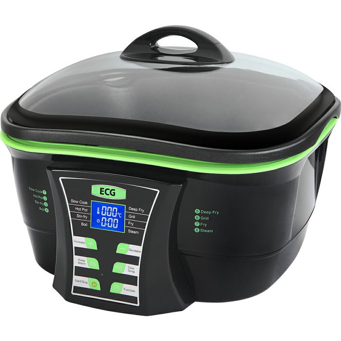 9 funkcija – fondue, sporo kuhanje, prženje, pirjanje, kuhanje, duboko prženje, roštiljanje, pečenje, kuhanje na paru Kapacitet zdjele od 5 l Kontrola temperature od 50 do 240 ° C Dodatna oprema: 6 setovaza fondue, pregrada za kuhanje na pari, pregrada za roštiljanje, posuda za kapanje ulja, košaru za prženje Ulazna snaga 1500 W