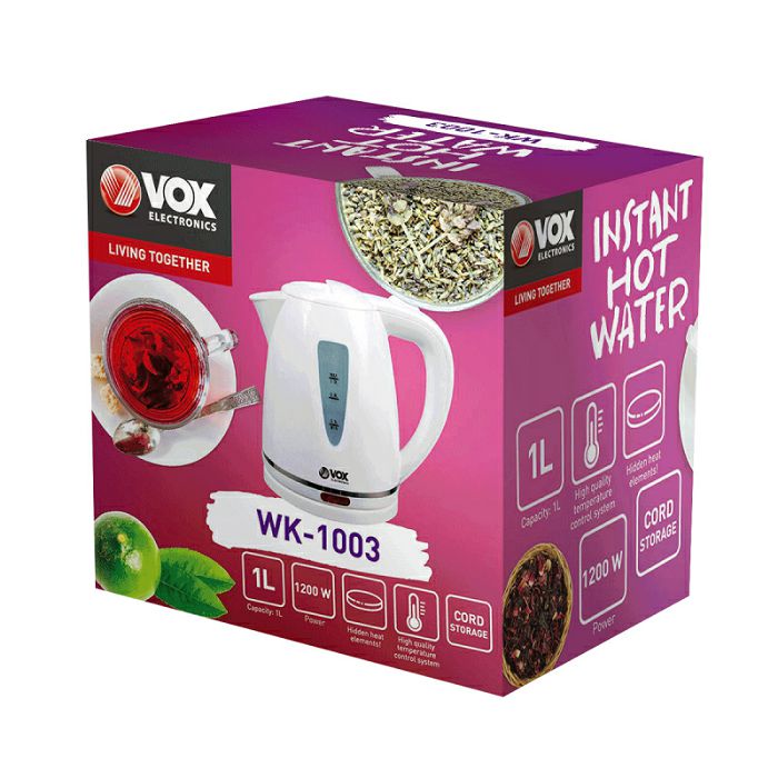 Vox-Electronics bojler WK-1003 snage 1200 W osigurava brzo i jednostavno zagrijavanje vode. Ima zapreminu od 1 litre. Izrađen je od plastike bez BPA i ima posebno mjesto za pohranjivanje kabela. Za sigurnu upotrebu pobrinut će se automatsko isključivanje prilikom kuhanja, zaštita od rada bez vode i automatsko isključivanje kada se kuhalo skine s postolja. Grijač za vodu osigurat će vam jednostavnu i brzu pripremu šalice omiljenog čaja ili kave. Tehničke karakteristike: - Zapremina: 1,0 l - Skriveni grijač od nehrđajućeg čelika - Automatsko gašenje (rukovanje uređajem je potpuno sigurno) - Materijal izrade: plastika - BPA free - Prostor za skladištenje kabela - Rotacija: 360° - Snaga: 1200 W - Ostale prednosti: automatsko isključivanje prilikom vrenja, automatsko isključivanje prilikom skidanja kuhala s postolja, dvostruka stijenka, puna posuda s obje strane, zaštita od rada bez vode