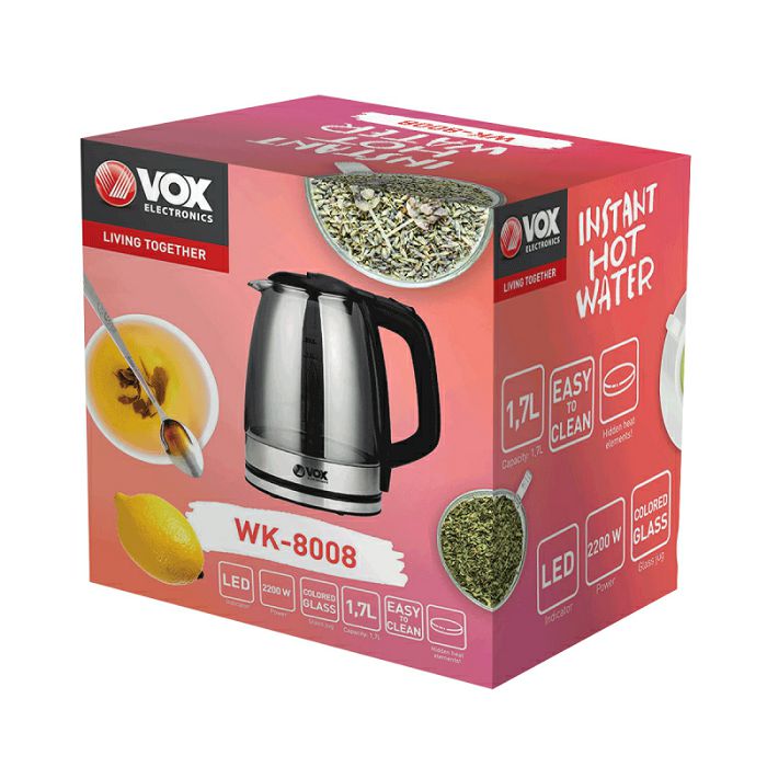 Vox-Electronics bojler WK-8008 snage 2200 W osigurava brzo i jednostavno zagrijavanje vode. Zapremnine je 1,7 litara. Izrađen je od stakla i ima posebno mjesto za odlaganje kabla. Za sigurnu upotrebu pobrinut će se automatsko isključivanje prilikom kuhanja, zaštita od rada bez vode i automatsko isključivanje kada se kuhalo skine s postolja. Grijač za vodu osigurat će vam jednostavnu i brzu pripremu šalice omiljenog čaja ili kave. Tehničke karakteristike: - Zapremina: 1,7 l - Skriveni grijač od nehrđajućeg čelika - Automatsko gašenje (rukovanje uređajem je potpuno sigurno) - Materijal izrade: staklo u boji - Prostor za skladištenje kabela - Rotacija: 360° - Snaga: 2200 W - LED osvijetljena unutrašnjost - Dimenzije uređaja (VxŠxD): 205 x 172 x 229 mm - Dimenzije uređaja u pakiranju (VxŠxD): 210 x 180 x 235 mm - Ostale prednosti: automatsko isključivanje prilikom vrenja, automatsko isključivanje prilikom skidanja kuhala s postolja, dvostruka stijenka, puna posuda s obje strane, zaštita od rada bez vode