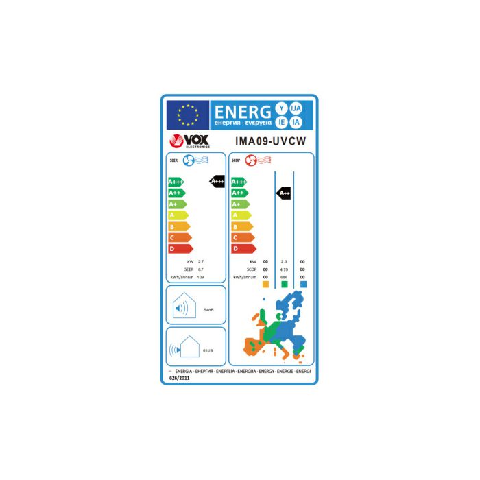 - Energetska učinkovitost: s impresivnom ocjenom A+++ za hlađenje i A++ za grijanje, VOX IMA09-UVCW nudi vrhunsku učinkovitost i izvanrednu uštedu energije.