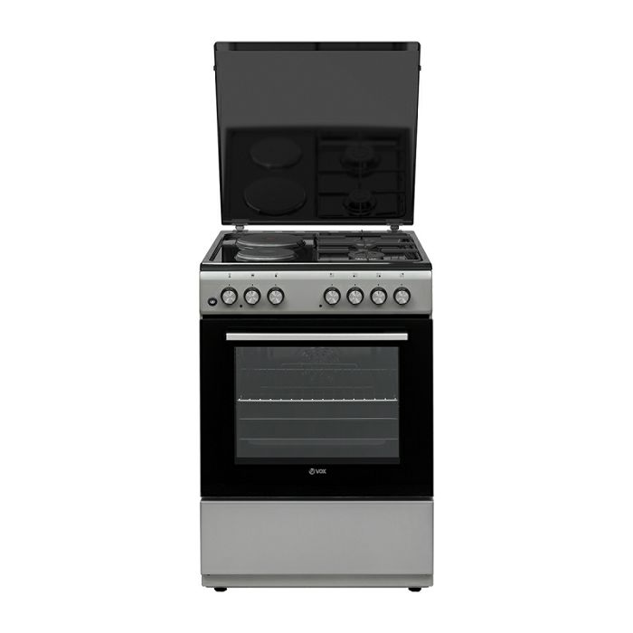 TEHNIČKE SPECIFIKACIJE: - Kategorija: kombinirani štednjak - Energetski razred: A - Broj grijaćih zona: 4 * Ploča 1: polubrzi plinski plamenik 75 mm, 1750 W * Ploča 2: brzi plinski plamenik 100 mm, 2750 W * Ploča 3: električna ploča za kuhanje 145 mm, 1000 W * Ploča 4: električna ploča za kuhanje 180 mm, 2000 W - Vrsta pećnice: električna - Ostalo: besplatan strujni kabel, dva pladnja, kromirana rešetka, jednostavno čišćenje, ladica za pohranu - Zapremina pećnice: 65 l - Broj načina pečenja: 8 - Gornji grijač: 1200 W - Donji grijač: 1100 W - Električni roštilj: 1400 W - Indeks energetske učinkovitosti - standard: 105,7 - Indeks energetske učinkovitosti - s ventilatorom: 94,8 - Potrošnja električne energije - standard: 0,87 kWh/ciklus - Potrošnja električne energije - s ventilatorom: 0,78 kWh/ciklus - Komplet za pretvorbu plina: da - Gumb za gas: da - Sigurnosni ventil plamenika: da - Funkcija odmrzavanja: da - Timer: mehanički - Dimenzije uređaja (VxŠxD): 850 x 600 x 600 mm - Dimenzije zapakiranog uređaja (VxŠxD): 922 x 645 x 684 mm - Neto težina: 43,03 kg - Bruto težina: 44,91 kg - Boja: srebrna