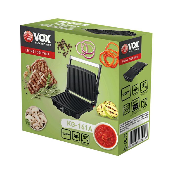Tehničke karakteristike: - Snaga: 2000 W - Dimenzije panela: 24x24 cm - Termostat: omogućuje reguliranje temperature po želji - Non-stick ploče (ploče omogućuju iznimno jednostavno čišćenje) - Ostalo: dodatna posuda za odlaganje preostalog ulja i masti, toplinski izolirana ručka, svjetlosna signalizacija, elegantan dizajn od nehrđajućeg čelika, prostor za odlaganje kabela - Neto težina: 2,1 kg - Bruto težina: 2,5 kg - Dimenzije uređaja (VxŠxD): 11,9 x 33 x 35,1 cm - Dimenzije uređaja u pakiranju (VxŠxD): 16,4 x 38,2 x 38,9 cm