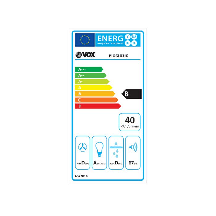 Uz impresivnu klasu energetske učinkovitosti B i godišnju potrošnju energije od samo 40 kWh, VOX Electronics PIO6L03W dokazuje da je moguće kombinirati snagu i ekonomičnost. Dinamička učinkovitost tekućina s indeksom 17,8 ističe visoku učinkovitost uklanjanja nečistoća iz zraka.