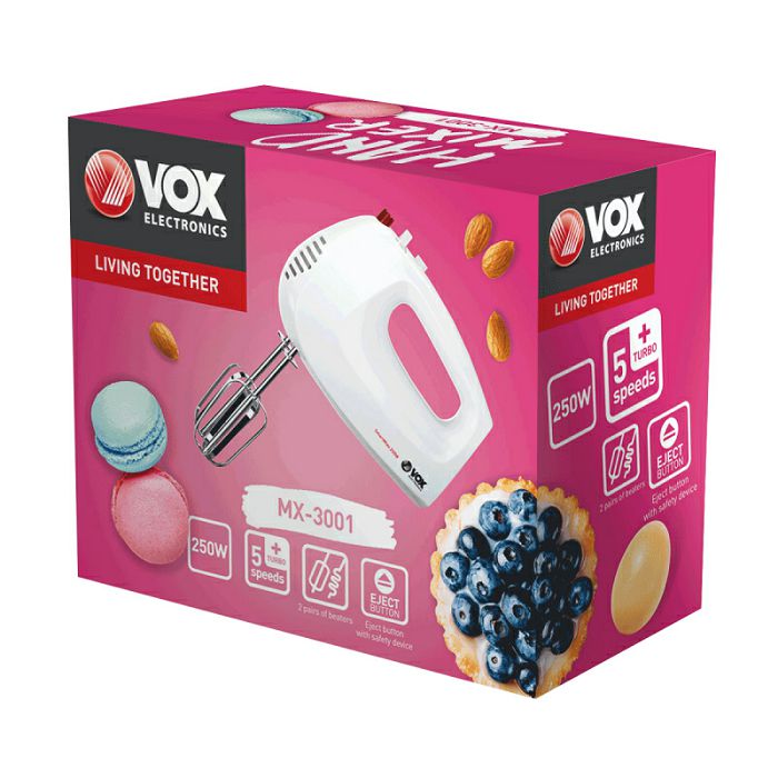 Ručni mikser VOX MX-3001 vrlo je praktičan mikser, a sa 250 W nezaobilazan je alat za sve koji vole peći razna peciva i kolače. Mikser omogućuje slobodno podešavanje brzine miješanja, odnosno 5 različitih brzina, ovisno o hrani koju pripremate. Omogućuje i "turbo" funkciju koja vam je uvijek dostupna.