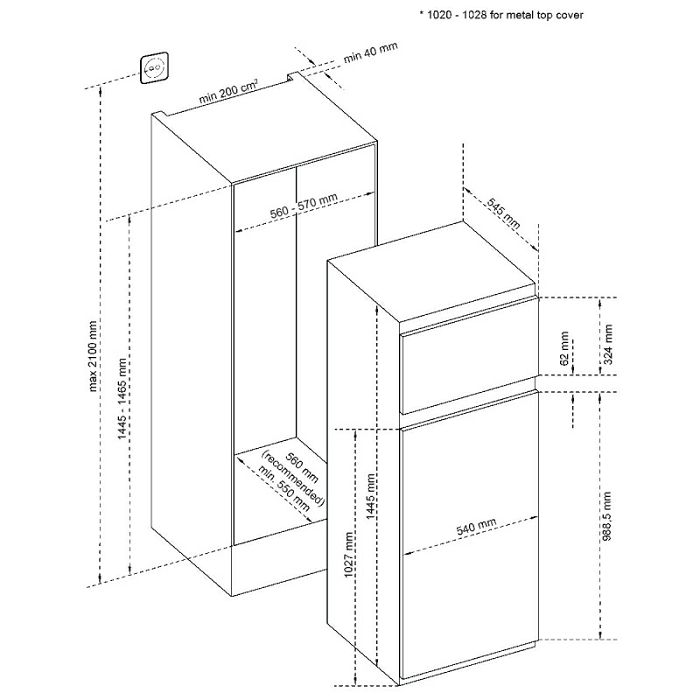 • Kompaktne dimenzije: Veličina hladnjaka je 1445 x 540 x 545 mm, što omogućuje jednostavnu ugradnju u standardne kuhinjske niše.