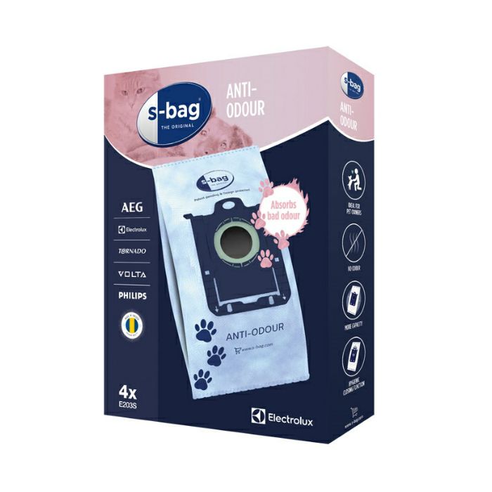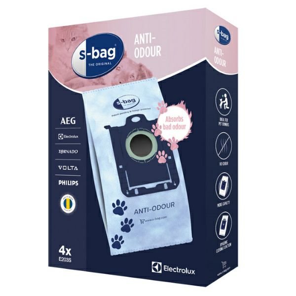 s-bag E203S Vrećice za usisavač S-bag Anti-Odour: apsorbira i neutralizira neugodne mirise Za razliku od običnih papirnatih vrećica koje apsorbiraju vlagu, vrećica s-bag® Anti-Odour upotrebljava otporni sintetički materijal prevučen s voskom koji apsorbira miris, kako bi zarobio neugodne mirise i spriječio ih da pobjegnu iz usisavača Veća usisna snaga: otporni sintetički materijal ove vrećice osigurava optimalan protok zraka i vašem usisavaču daje konstantnu usisnu snagu dok se vrećica puni Visoki kapacitet filtriranja: s-bag Anti-Odour sintetički materijal filtrira do 99 % prašine, peludi, alergena i drugih čestica 4 vrećice u paketu