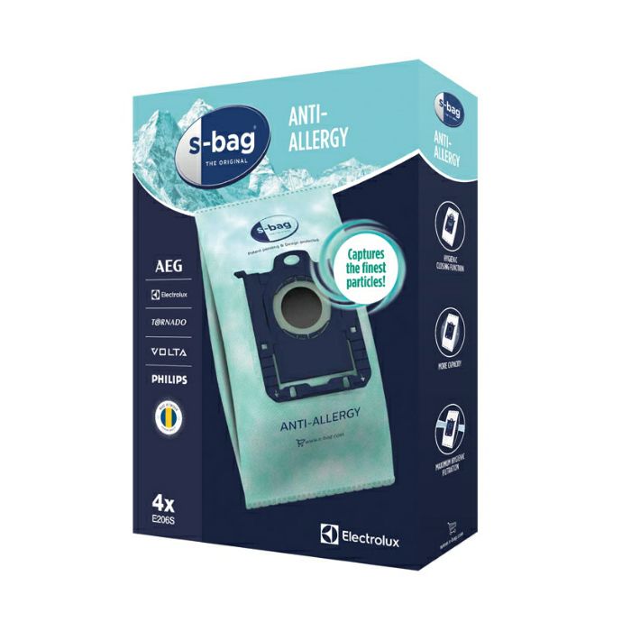 s-bag E206S Vrećice za usisavač S-bag Anti-Allergy štiti vaše zdravlje, značajno doprinosi higijeni i čistoći zraka u vašem domu, a još uvijek pruža izvrsne performanse S-bag Anti-Allergy smanjuje izlaganje alergenima i opasnost od alergena po vašu obitelj Visoki kapacitet filtriranja: s-bag Anti-Allergy ima visoku filtraciju za pelud, čestice prašine, grinje, alergene grinja i alergene mačaka manje od 1 mikrona (15 puta manje od promjera ljudske kose) Ova razina filtracije korisna je za astmatičare i alergičare 4 vrećice u paketu